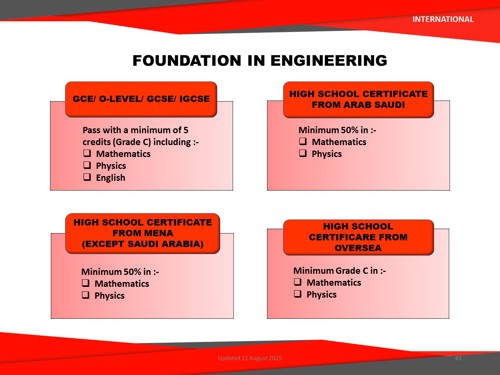 The Foundation in Engineering program is designed to prepare you for professional careers and to further your studies toward a Bachelor's Degree in a related engineering field. We adopt comprehensive and innovative content and teaching techniques, aimed at expanding the frontiers of learning and fostering a probing mind.