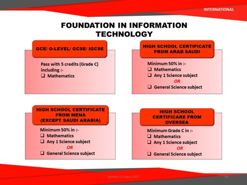 Students who have successfully completed their Foundation in Information Technology programme will be able to enter into the Bachelor of Information Technology (Information Systems) (Hons), Bachelor of Information Technology (Visual Media) (Hons), and Bachelor of Information Technology (Graphics & Multimedia) (Hons).