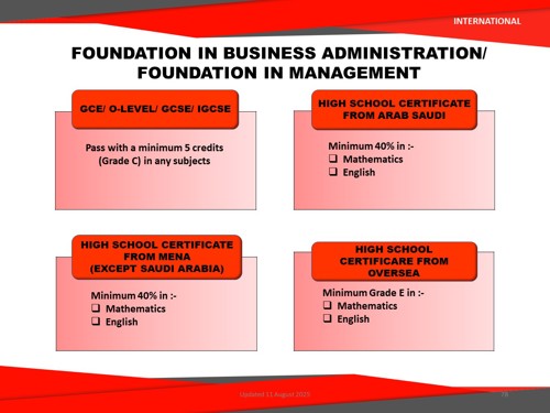 For International Students: Entry requirements vary from country to country. Please click here to check the entry requirements set by the Malaysian Qualifications Agency (MQA).
