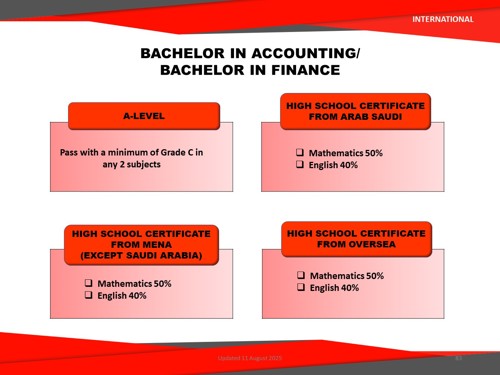 This programme is specifically designed to prepare students with strong knowledge in accounting field before they get into the real world of accounting professions or pursue their studies to obtain a Masters' degree in accounting or in other business-related postgraduates programmes.